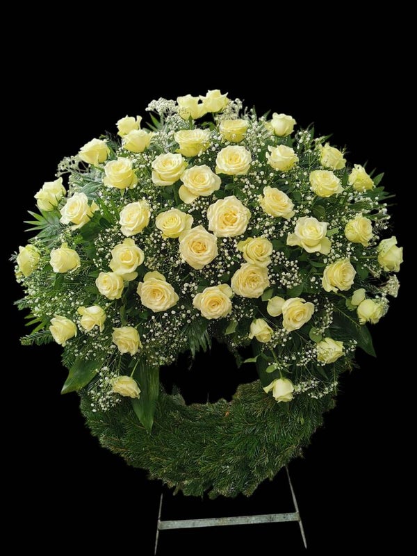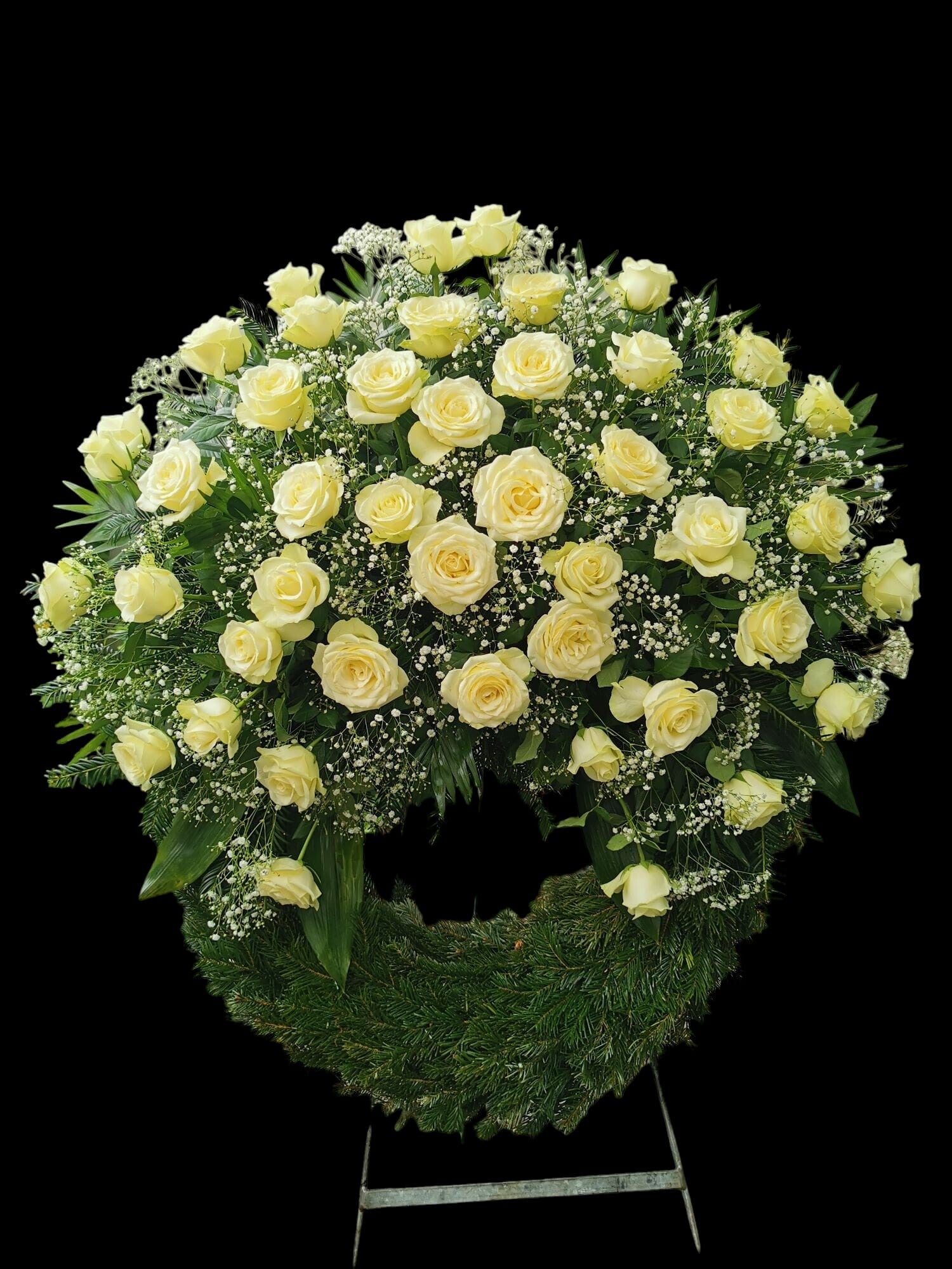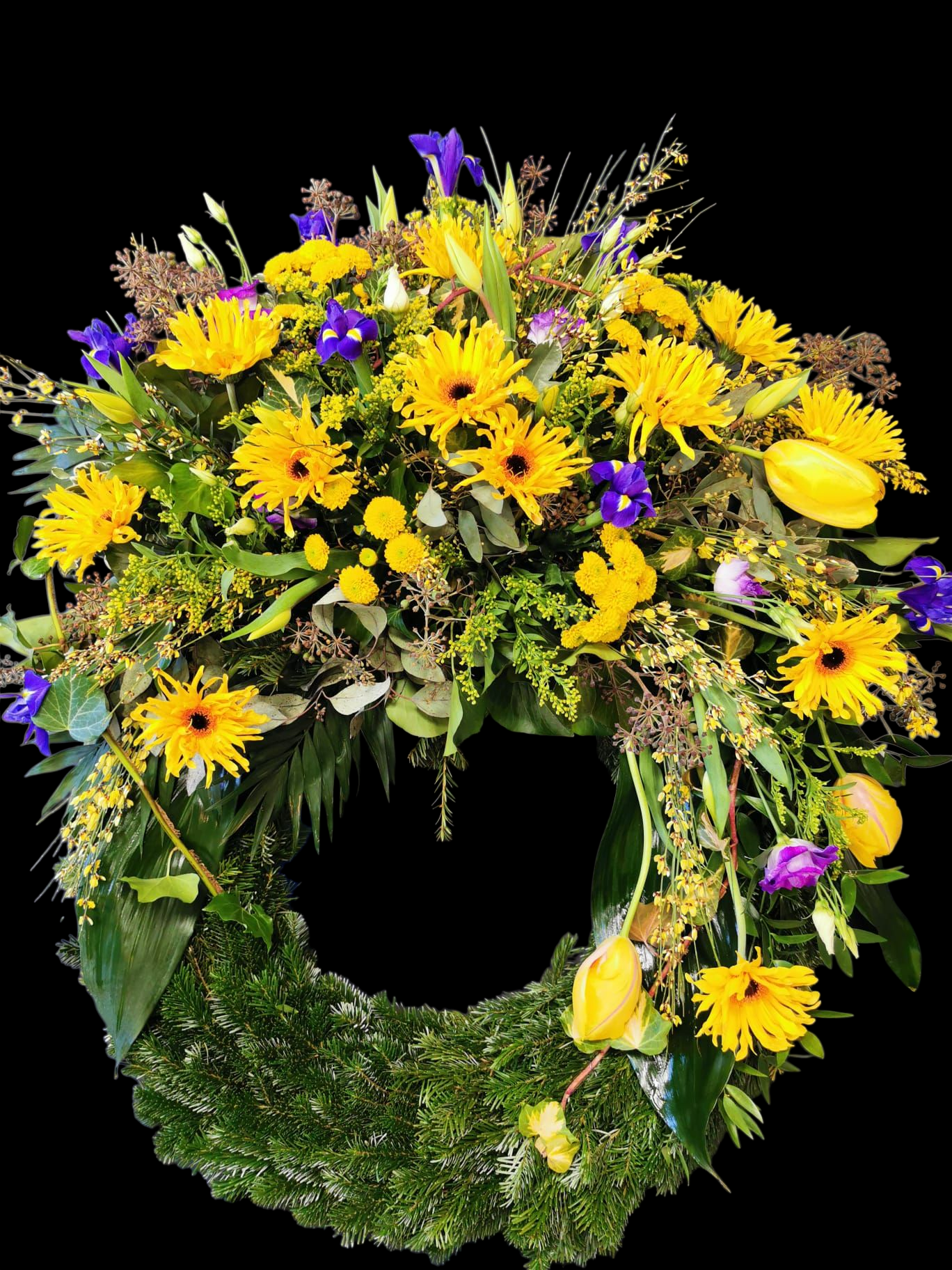Der klassische Trauerkranz mit Kopfgarnierung ist ein zeitloses Zeichen des Abschieds. Seine runde Form steht für Ewigkeit und unendliche Verbundenheit. Die Kunstvoll gearbeitete Kopfgarnierung - mit ausgewählten, edlen Blüten am oberen Kranzbereich - verleiht dem Arrangement besondere Präsenz. In fließenden Linien gestaltet, entsteht ein harmonisches Gesamtbild, das Würde und Erhabenheit ausstrahlt.
